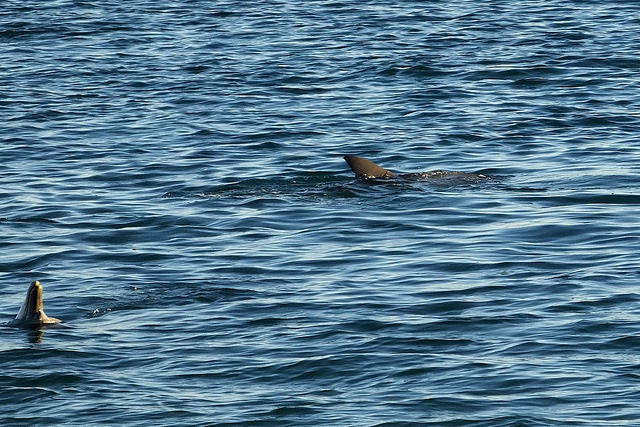 ... und die ersten Delphine schwimmen bereits in der Bucht umher. Seit den 50ern glaube ich kommen die Delphine hierher in die Bucht. Seit 1994 überwachen die Ranger die Fütterung, max 1/3 des Tagesbedarfs bekommen die Erwachsenen. Jungtiere bekommen gar nichts, damit sie lernen sich selbst zu versorgen.