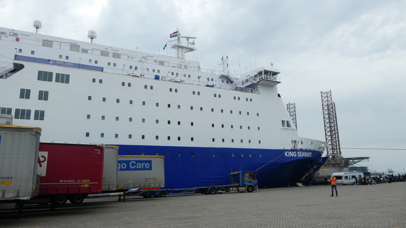 Wir fahren ans Terminal ran und brauchen lediglich unsere Personalausweise vorzeigen. Wir werden noch gefragt, ob wir ein Abendessen buchen wollen. Aber das wollten wir nicht, denn das wollten wir spontan entscheiden, da wir nicht wussten, wie schlecht es Heiko gehen würde. Dem wurde nämlich schon mulmig, als wir kurze Zeit später in unsere Wartereihe geleitet wurden und wir die King Seaways sehen konnten.