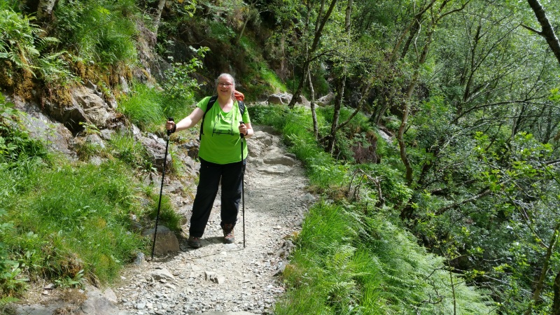 Das Wetter war wieder super, wir trugen bloß unsere T-Shirts. Selbst hier im schattigen Wald ist es warm genug dafür.  Ich hätte nie im Leben gedacht, dass ich nun schon den dritten Tag in Folge zu keinem Zeitpunkt die Regenjacke bräuchte.  Also eigentlich ist das nicht „mein Schottland“, aber ich bin gar nicht so böse darum. Zumal der Wetterbericht schon andeutete, dass es nicht die ganze Woche so bleiben würde. Und hier auf dem felsigen Boden war ich doppelt froh, dass die Steine nicht vom Regen nass und glitschig sind.