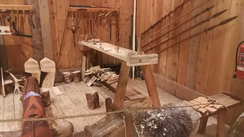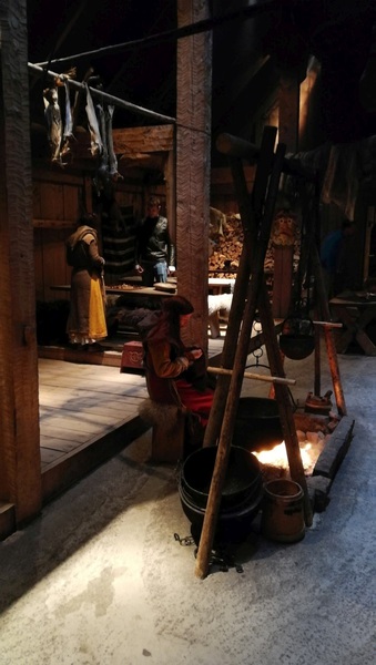Øy und war ein Häuptlingssitz der Wikinger. Bei Ausgrabungen wurden die Reste eines Langhauses gefunden und dieses nachgebaut. In der Wikingerzeit standen dort wohl über 100 Höfe mit 1.800 Bewohnern. In der Eingangshalle gibt es einen Museumsshop, ein Café, WC und Informationstafeln zur Geschichte der archäologischen Funde. Für 18.- € pro Personen bekamen wir einen Audioguide, mit dem man im Nebenraum zu Werkzeug, Waffen Schmuck, Kleidung etc. – was alles in Glaskästen untergebracht ist - Informationen abrufen konnte.