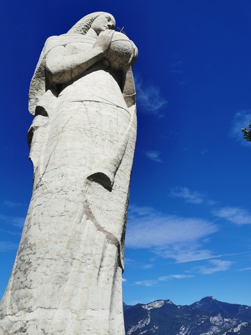 Die Madonnenstatue „Regina Mundi“, die in der Nähe des ins Ledrotal führenden Straßentunnels steht, ist seit den 1970er Jahren ein Wahrzeichen des Ortes. Sie wurde bereits 1955 von Fra Silvio Bottes geschaffen, ein Mönch aus dem Kloster Delle Grazie in Arco, der auch das Hauptportal der Kirche in Pregasina fertigte. Ursprünglich sollte die 5 Meter hohe und 8 Tonnen schwere Statue, die aus vier Blöcken herausgearbeitet wurde, auf dem Dach des Ferienheims der Pfarre Locca im Valle di Concei aufgestellt werden. Aufgrund des Gewichtes musste man von dem Vorhaben allerdings absehen und stellte sie vor dem dortigen Pfarrhaus auf. Auf Betreiben der Bevölkerung Pregasinas wurde sie 1976 an ihren jetzigen Standort gebracht und 1977 geweiht.Ausblick von hier oben