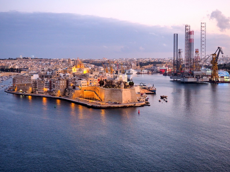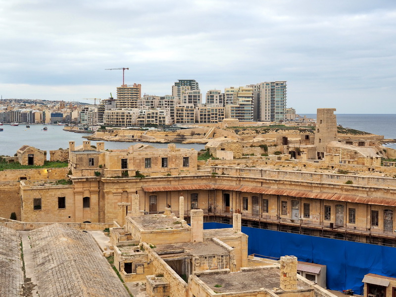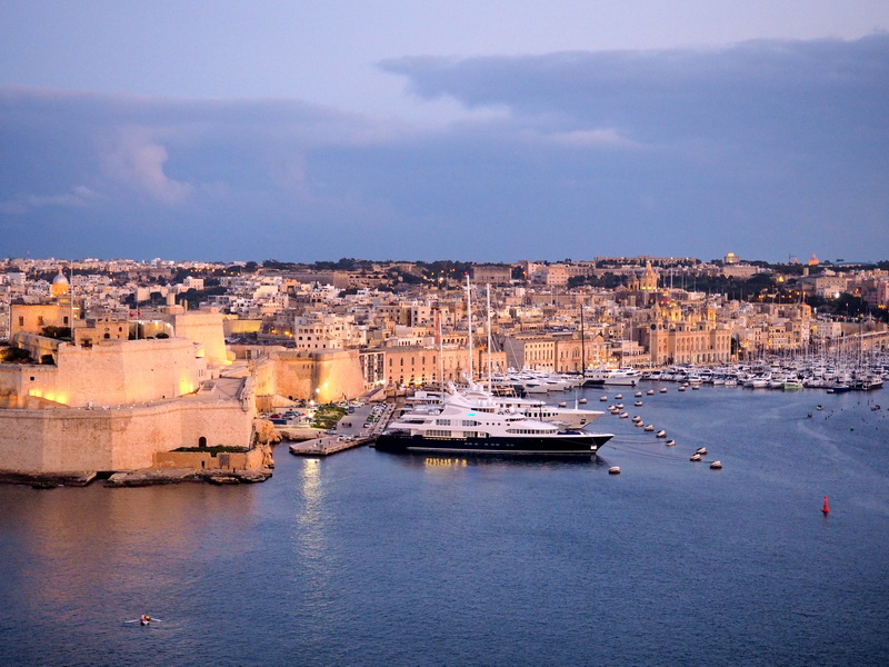Gegen 17 Uhr sind dann alle «Pflichten» für heute erledigt. Ich schnappe mir meine Kamera und gehe bzw. fahre mit dem Aufzug zur kleinen Dachterrasse des Hotels. Von hier hat man einen schönen Blick auf den Grand Harbour und die «Three Cities» Birgu, L-Isla und Bormla gegenüber – wunderbar.