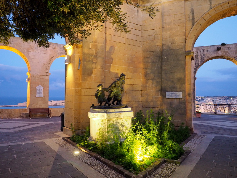 Dann spaziere ich zu den Upper Barrakka Gardens. Der ehemalige Exerzierplatz der Ritter auf der Stadtmauer ist heute ein hübscher Park mit Springbrunnen, Café, Bänken, verschiedenen Skulpturen und vor allem einer Aussichtsgalerie. Man schaut auch hier auf die «Three cities», auf einen Teil der Stadt und auf die «Saluting Battery» darunter, eine Reihe Kanonen, die zweimal täglich zur Touristenbelustigung abgefeuert werden. Eine ganze Zeit lang genieße ich den Blick, als es für Fotos ohne Stativ zu dunkel wird, spaziere ich noch ein wenig durch den Park und gehe auf einem Umweg zurück zum Hotel. Die Beleuchtung der Gebäude, die ich heute gesehen habe, ist wirklich sehr stimmungsvoll und ich werde auf jeden Fall an einem der anderen Abende noch mit dem Stativ losziehen.
