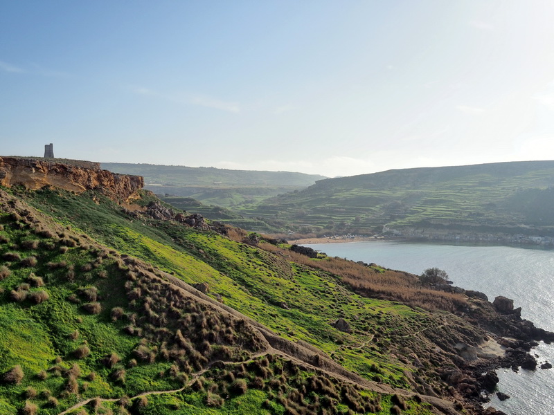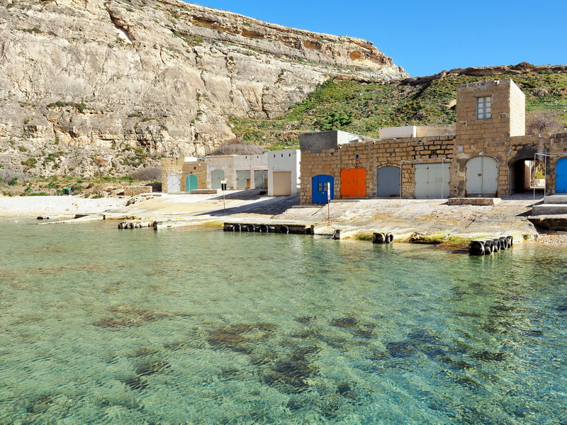 Dorthin und auf die Bänke entlang des Hafens zieht es dann die anderen Touristen, ich bin die einzige, die sich auf den Weg in den nächsten Ort macht. Das ist mir so alleine ein wenig unangenehm, aber ich werde weder von den an ihren alten Booten und Autos arbeitenden Einwohnern beachtet, noch von Hunden angebellt und nach einiger Zeit begegnet mir sogar ein Ehepaar und etwas später eine Joggerin, da bin ich wieder beruhigt. Mit dem Rücken zum Ort Marsaxlokk blickt man dann auf die weniger idyllische Seite, das Kraftwerk und später in der Nähe des nächsten Ortes Birzebbuga, die Kräne des Containerhafens. Es gibt aber auch türkisfarbenes Wasser, Sandstrände und interessante Felsformationen zu sehen, ebenso ein Fort (Fort St. Luciano).