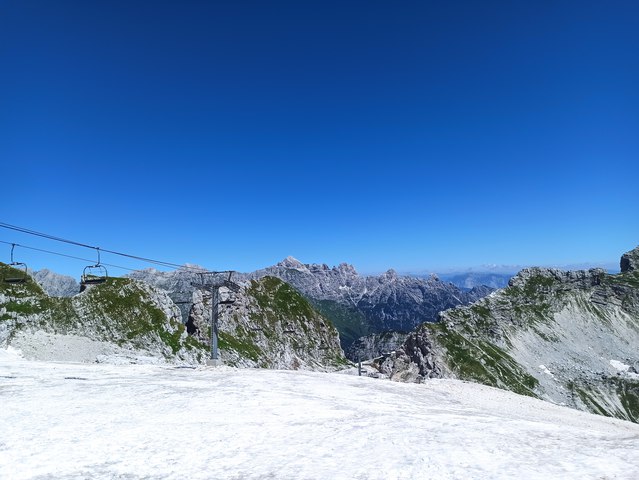 Die Seilbahn in Bovec ist knapp 6 km lang, hat 53 Stützen und man überwindet in einer Fahrzeit von knapp 30 min eine Höhe von fast 1.800 m. In eine Gondel passen 4 Personen, wir waren aber nur zu zweit. Es war nicht viel los, es verteilte sich sehr gut.