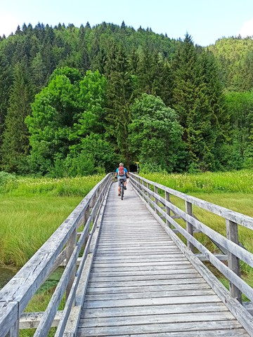 Es war noch früh am Tag, so dass wir noch etwas mit dem Rad fuhren. Eigentlich wollte ich zum Jasna-See, wir sind aber irgendwie daran vorbeigefahren. Als wir auf Maps schauten, waren wir ein paar Kilometer davon entfernt, jedoch kurz vor einem Naturschutzgebiet namens Zelenci. Und was soll ich sagen, ein Traum! Der Weg dahin führte über eine Brücke