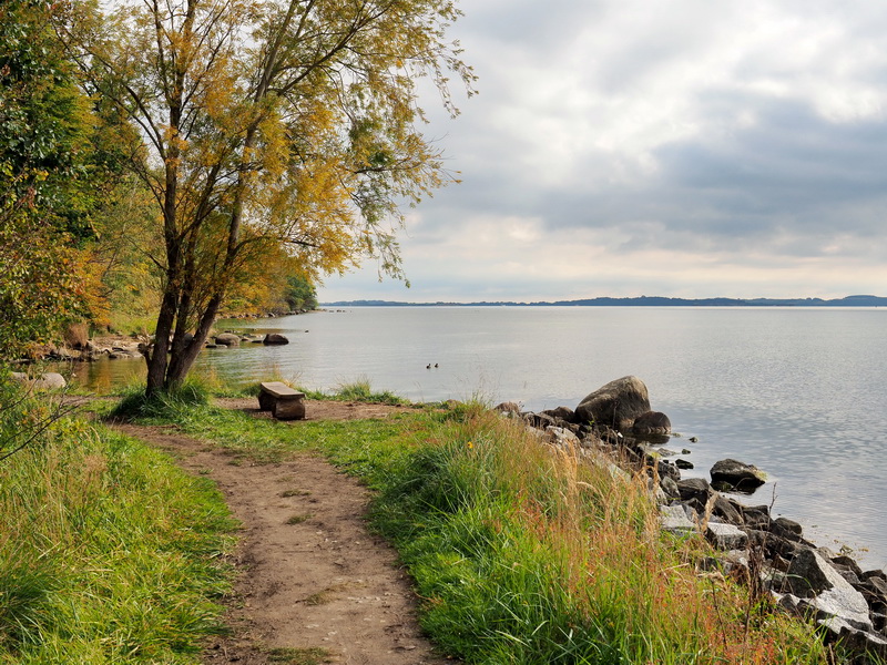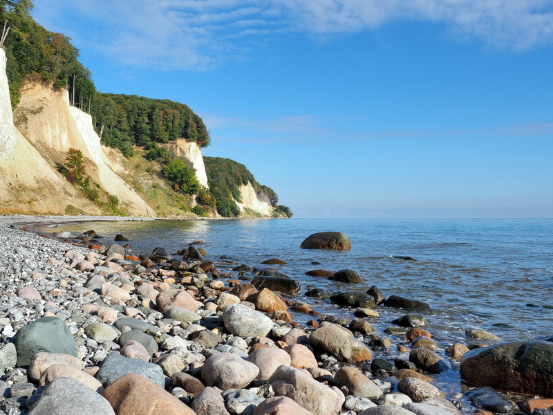 Am Ortsausgang von Neuendorf beginnt eine mit einem Wäldchen bewachsene relativ niedrige Steilküste. Der Pfad schlängelt sich durch den Wald immer mit Blick auf den Bodden – wieder mal ein besonders schönes Fleckchen Rügen – die Sonne scheint, im stillen Wasser spiegeln sich Himmel und Wald und Steine, immer wieder gibt es kleine (Bade-)buchten, es sind nur wenige Leute unterwegs, einfach nur friedlich und schön.