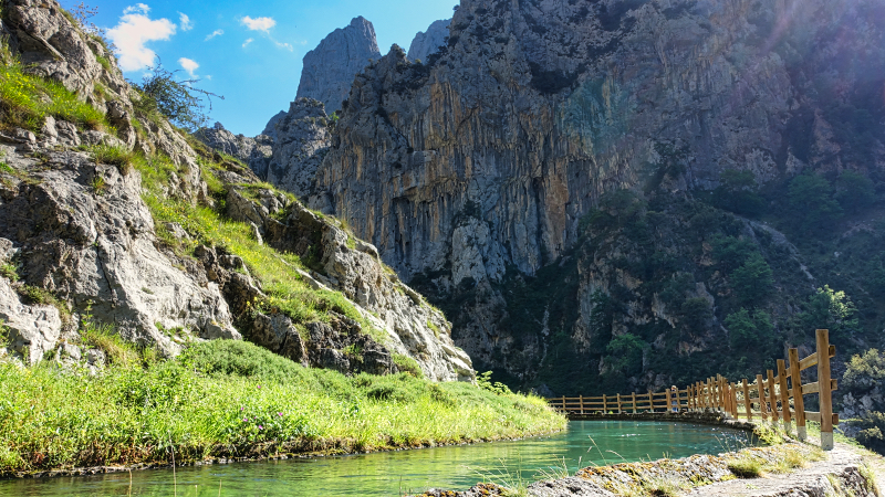 Eine der atemberaubendsten Routen in den Picos de Europa. In einem sagenhaften Kraftakt wurde von 1915 bis 1921 weit oberhalb des Flussbettes ein Wasserkanal durch 71 Tunnel in den Fels geschlagen, um das Wasser des Cares den Elektrizitätswerken bei Camarmeña und Arenas de Cabrales zuzuleiten. Über 500 Arbeiter – Männer, Frauen und Kinder – waren dafür im Einsatz, 11 starben dabei.