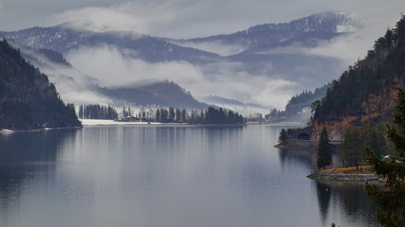 Von unserem Domizil in Kreuth am Tegernsee fahren wir die im Sommer mautpflichtige Strecke 307 durch das Isartal am von Nebel völlig verschluckten Sylvensteinstausee vorbei nach Mittenwald und von dort zum Walchensee.