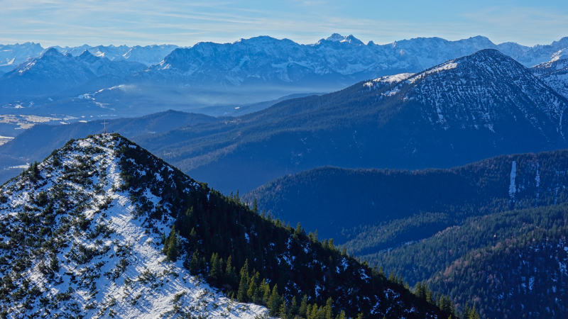 Hoch über dem Tegernsee bieten sich schöne Ausblicke auf die umliegende Bergwelt der Bayerischen und Tiroler Alpen.