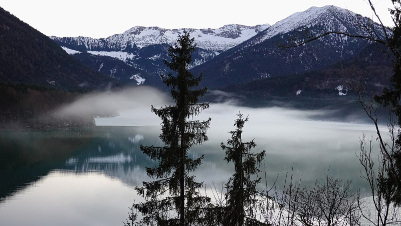 Während im Isartal schon wieder Nebel aufkommt gehen wir eigentlich von nicht mehr viel aus, als wir den Sylvensteinstausee erreichen - immerhin ist er im Gegensatz zu heute morgen erkennbar.