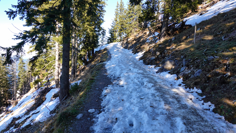Auch von der Bergstation starten Wanderwege. Einer davon führt Richtung Wallberggipfel, den gehen wir ein Stück, allerdings eine wirklich eisige Strecke die mit unserem untauglichen Schuhwerk sehr unangenehm zu laufen ist.