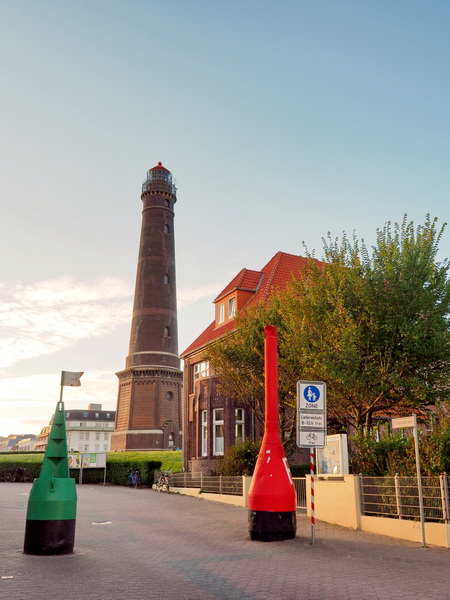 Nicht weit vom Heimatmuseum ist der Alte Leuchtturm. Er kann nicht bestiegen werden, der Eingangsbereich ist aber geöffnet, man kann sich eine Ausstellung zur Geschichte des Turms anschauen, da stelle ich mich dann gleich während des jetzt einsetzenden Regens unter. Mit dem Bau des Leuchtturms wurde 1576 begonnen, als Standort wurde die erhöhte Lage der Kirchenwarf ausgesucht. Den dort vorhandenen Kirchturm riss man ab (da als Leuchtturm zu niedrig) und errichtet an seiner Stelle den 41 m hohen Turm. Die Glocken aus dem abgerissenen Kirchturm wurden im Leuchtturm aufgehängt, der nun Leucht- und Kirchturm gleichzeitig war.