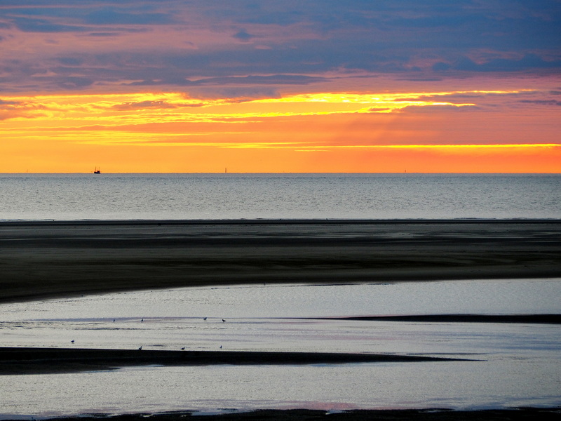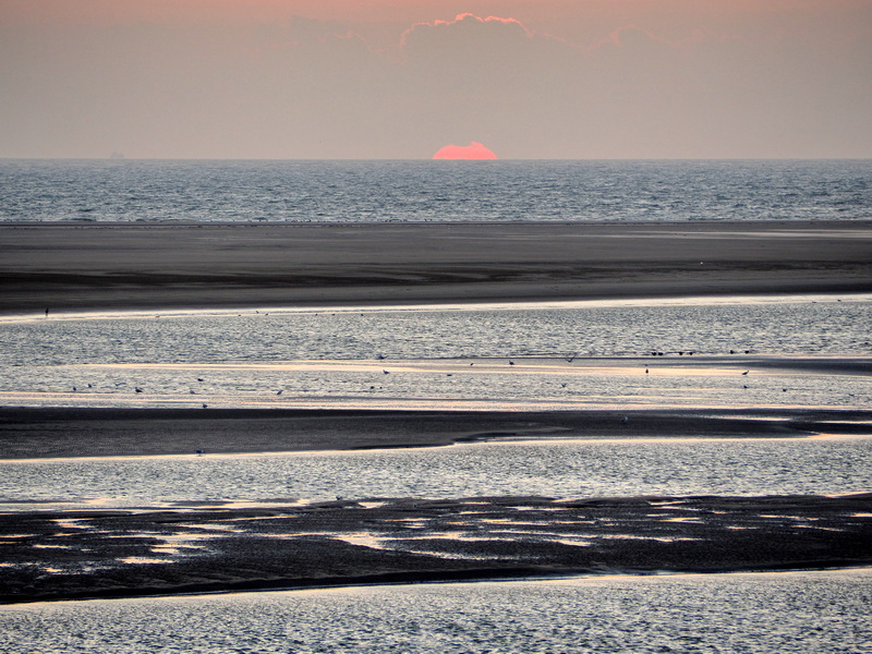 Als ich mir bei der Reisevorbereitung die Uhrzeiten der Gezeiten während meines Aufenthalts auf Borkum angeschaut habe, habe ich wenig erfreut festgestellt, dass ausgerechnet in dieser Woche während des Sonnenuntergangs Ebbe herrscht und während meines gesamten Aufenthalts ein extremes Niedrigwasser. Das macht schöne Sonnenuntergangsfotos schwer mangels Spiegelung von Licht und Sonne im Wasser bzw. im nassen Sand. Leider bestätigt sich meine Befürchtung. Aber egal, ich werde das Beste daraus machen.