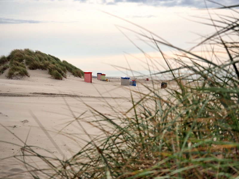 Am Südstrand sehe ich die für Borkum typischen Strandzelte (von einer Zeltplane umgebene Sitzbank mit einem dazugehörigen Holzliegestuhl, den man sich daneben in den Sand stellen kann, die aufwändigeren und bequemeren Strandkörbe sind hier aber inzwischen in der Mehrheit)