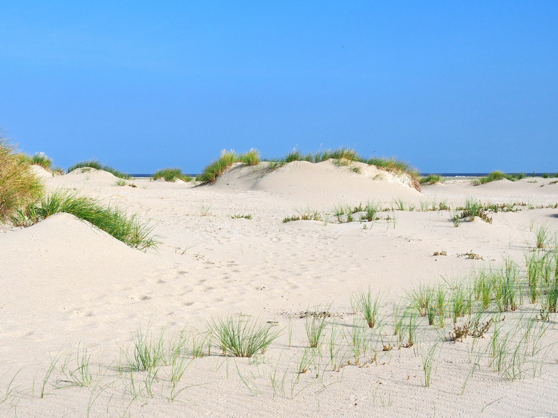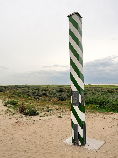 Bald hört die Bebauung auf und die nun schmalere Strandpromenade führt durch die Dünen. Das Kleine und das Große Kaap kommen in Sichtweite, diese dienten in früheren Zeiten den Fischern zur Orientierung, jede der Ostfriesischen Inseln hatte ein eigenes Symbol. Und ich komme am Pfeiler vorbei, der den nordwestlichsten Punkt Deutschlands kennzeichnet (auf einer Landfläche, auf dem Meer reicht Deutschland noch weiter, auch die vor diesem Punkt liegende Sandfläche ist nicht berücksichtigt, da sich diese immer wieder ändert, zur Zeit dehnt sie sich aus, früher reichte das Wasser bei Flut bis direkt unterhalb der Strandpromenade).
