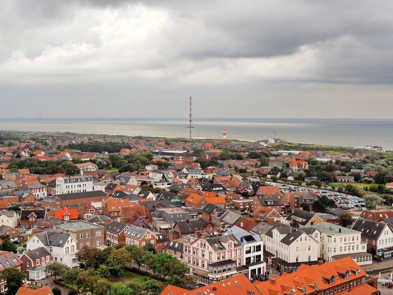 Der Neue Leuchtturm, wie schon geschrieben, 1879 erbaut, ist 63 m hoch, heißt amtlich Großer Leuchtturm, ist der westlichste Leuchtturm Deutschlands und ist bis heute aktiv. Was mich als Fan von Aussichtspunkten und Türmen freut, er kann bestiegen werden. Eigentlich würde ich mir den Aufstieg für besseres Wetter aufsparen, die Öffnungszeiten sind mit 11 bis 15 bzw. teilweise 16 Uhr aber so kurz, da bin ich bei schönem Wetter eher nicht im Ortszentrum. Daher geht es nun, nachdem ich meine Adresse hinterlegt und EUR 3 bezahlt habe (und natürlich die Maske aufgesetzt), die 315 Stufen nach oben. Die Aussichtsplattform ist leider von einem Gitter umgeben, in jeder Himmelsrichtung ist aber immerhin ein größeres Loch im Gitter, durch das man fotografieren kann. Der Blick ist herrlich, durch die Lage des Leuchtturms mitten im Ort kann dieser in allen Einzelheiten von oben angeschaut werden, auch meine Unterkunft entdecke ich.