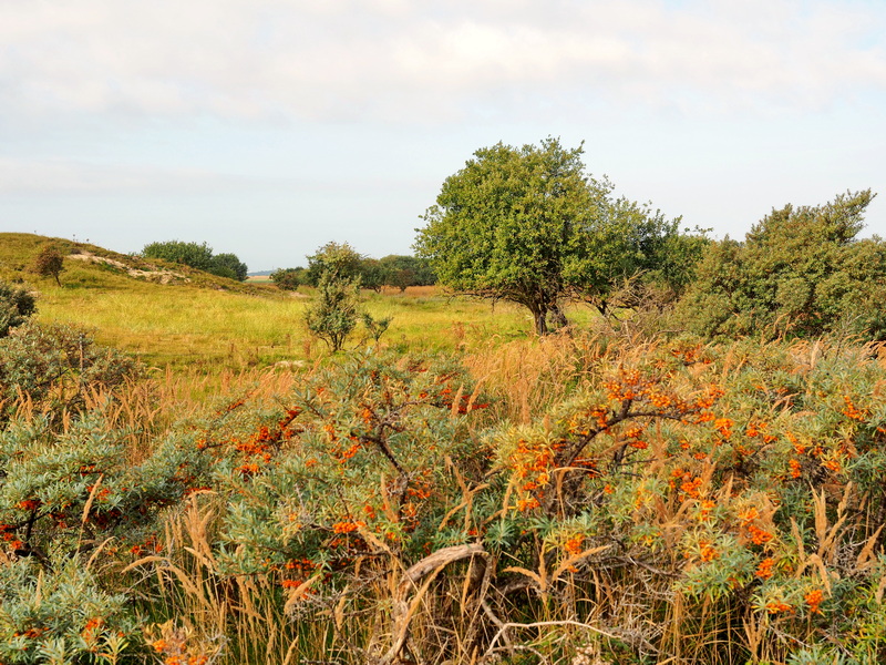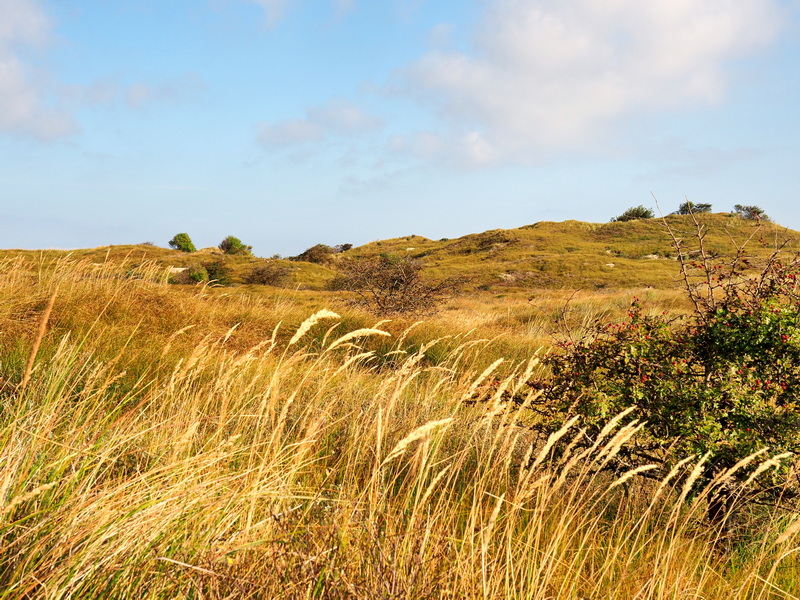 Diesen Weg dürfen auch Radfahrer nutzen und zwar bis zur Aussichtsdüne Steernklippdüne. Von oben hat man einen schönen Blick über Dünen mit verschiedenem Bewuchs bis zum Meer und in die andere Richtung bis zum Hafen.