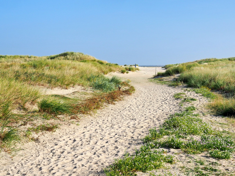 Östlich der beiden Bauernhöfe gibt es nur noch Natur. Zunächst geht es auf einem gepflasterten Weg durch die Dünen.