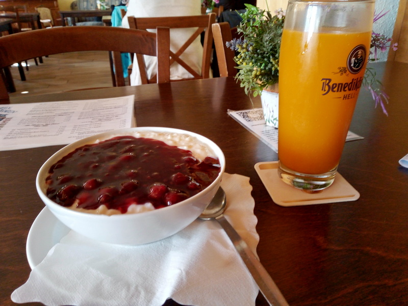 Es gibt viele Wege durch die Dünen, leider nur sehr spärlich ausgeschildert, da aber die Richtung klar ist, komme ich- nach der Mittagspause mit belegten Brötchen im Dünensand – und vielen Zweifeln, ob ich wohl auf dem richtigen Weg bin, gegen viertel vor zwei Uhr bei den Restaurants im Ostland an. Die beiden Biergärten sind gut belegt, ich setze mich aber gerne nach drinnen, bin ich doch schon viele Stunden in der Sonne ohne jeglichen Schatten unterwegs. Es gibt Milchreis mit roter Grütze und eine Sanddornschorle (EUR 10,50).