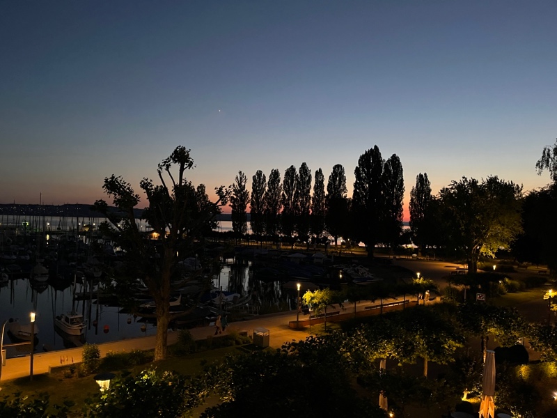 so haben wir erst mal die Räder zurück gebracht und sind dann zum Abendessen ins Restaurant Mainaublick gegangen. Gutbürgerliche Küche mit frischem Fisch aus dem Bodensee, preislich aber auch eher gehoben, wir haben zusammen 115 € gezahlt. Die Preise fürs Abendessen waren überall hoch, eher noch über dem Münchner Niveau, wir haben insgesamt viel mehr ausgegeben als ich veranschlagt hatte (ich spare aber im Urlaub nicht: wenn ich Vor- und Nachspeise essen will mache ich das auch).
