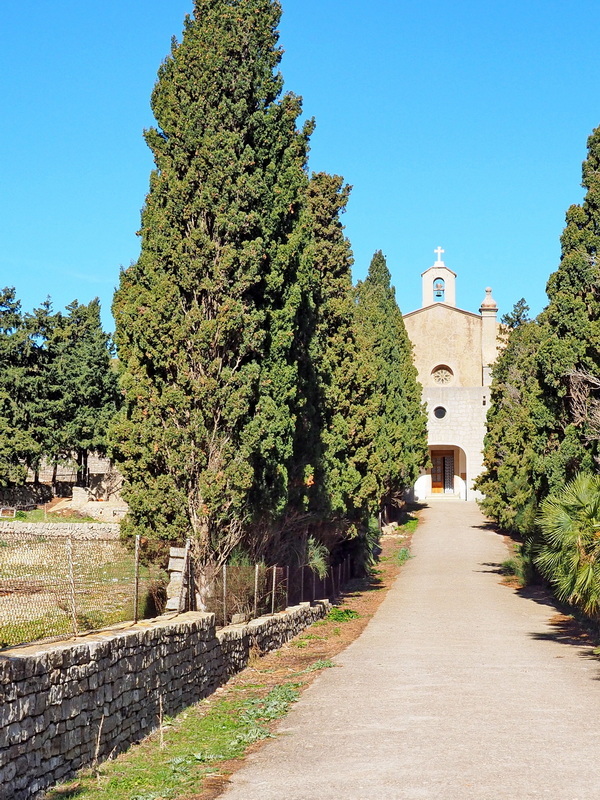 Dann gehe ich ein Stückchen den Berg hoch zum Kloster Sant Salvador, gegründet 1348, die Klosterkirche schaue ich mir von innen an, wieder mal ein sehr düsterer, dunkler, kaum beleuchteter Kirchenraum. Im Kloster kann man übernachten (auch buchbar auf booking.com z.B.), es gibt auch ein Restaurant. Auf dem Weg zwischen Kloster und Christusmonument sieht man auf einem Felsen etwas unterhalb das Steinkreuz Creu d’es Picot von 1957, dorthin ist es aber ein etwas längerer Spaziergang, für den ich jetzt weder Zeit noch Lust habe. Beim Blick zurück zum Parkplatz zeigt sich nochmal das Christusmonument. Ein sehr lohnenswerter Abstecher, der heute endlich mal bestens zu Zeit- und Fahrtstreckenplanung gepasst hat.
