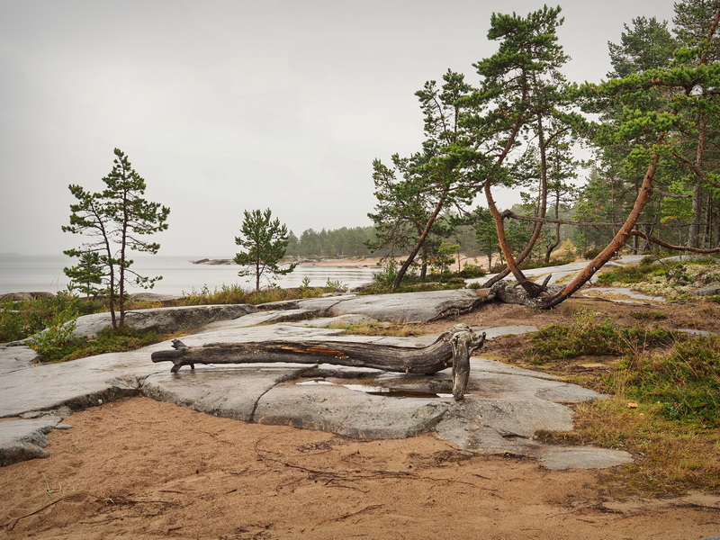 Ich laufe trotzdem los, auch hier gibt es ein ausgedehntes Boardwalk – Netz, dem ich zunächst zu einer Trockentoilette folge, die ich nutze und dann in Richtung Wasser gehe. Und hier ist es richtig schön, der Wald reicht bis an den Strand, es gibt viele kleine Sandbuchten, begrenzt von Granitfelsen, laut Beschreibung sind in der Ferne kleine Inselchen zu sehen. Die kann ich vor lauter Regen bzw. Nebel und tiefhängenden Wolken nicht mal erahnen, aber ich bin trotzdem begeistert.