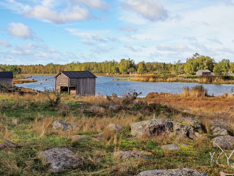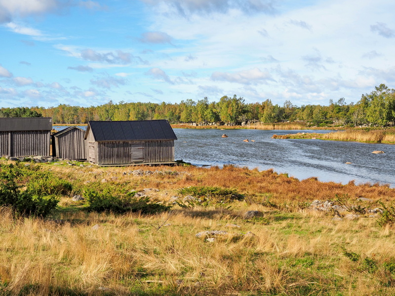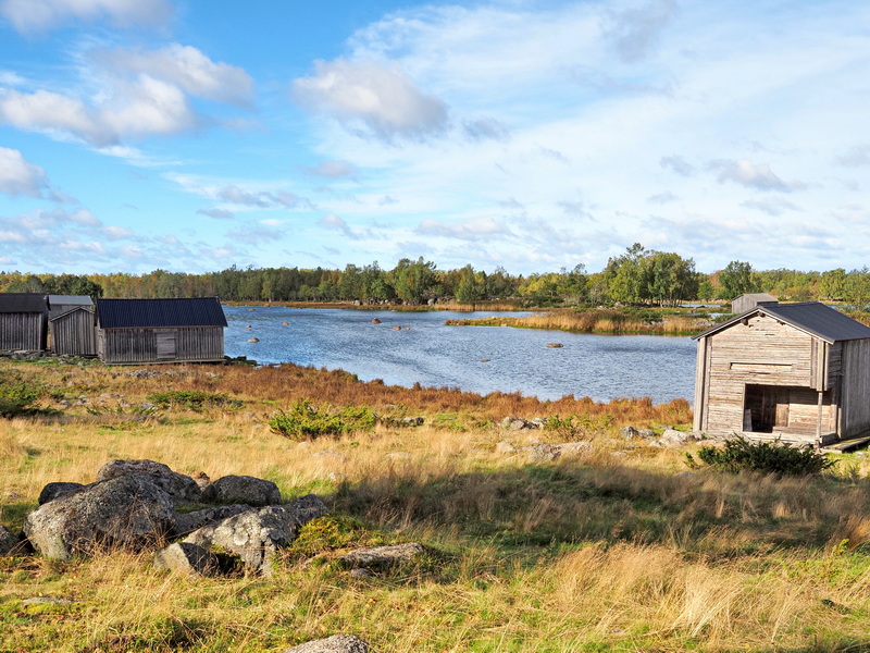 Bald kommen die ersten Hütten des ehemaligen Hafens Bodvattnet / Bodback in Sicht. Ungefähr 130 Bootsschuppen standen hier bis zur ersten Hälfte des vergangenen Jahrhunderts. Dann mussten sich die Inselbewohner einen neuen Platz zum Anlegen ihrer Boote suchen, denn die Landhebung führte dazu, dass das Wasser nicht mehr tief genug für Boote war. Das Wasser, das man heute hier noch sieht, wird künstlich auf diesem Level gehalten (warum das gemacht wird, konnte ich leider nicht herausfinden), ohne ein Eingreifen wäre vermutlich alles komplett trocken.
