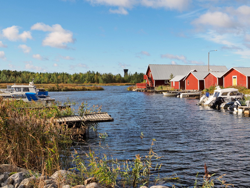 Ich gehe den Rundweg so, dass ich den Aussichtsturm erst am Ende erreichen werde. Wie auch im Hafen von Replot gibt es hier idyllisch aussehende rote Bootshäuser und Boote unterschiedlicher Art an denen mich der Weg vorbeiführt. Im Sommer hat in einem der größeren Häuser ein Restaurant geöffnet. In der Ferne kann ich schon den Aussichtsturm sehen. Wirklich schön ist es hier.