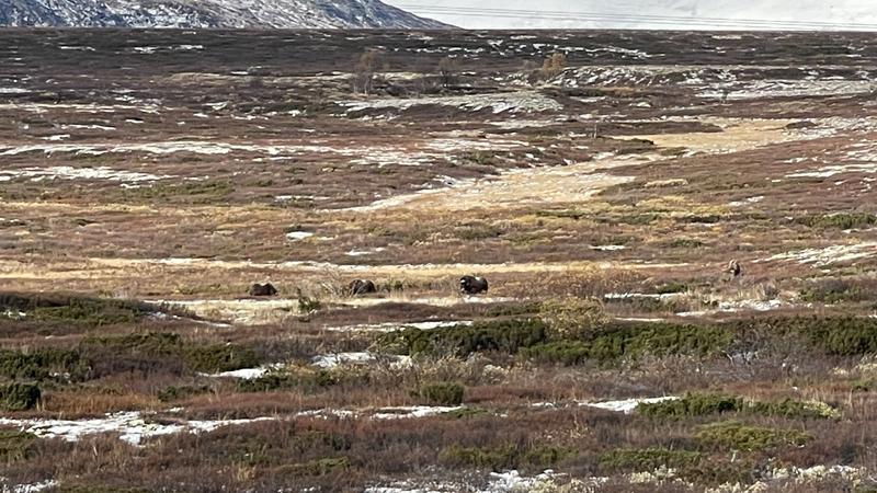 Unser Weg führte uns am Dovrefjell vorbei, dort, wo die Moschusochsen zuhause sind. Immer wieder liest man, dass man eine geführte Tour braucht, um die Moschusochsen aus nächster Nähe zu sehen… Als wir da so entlangfuhren, glaubte ich, welche zu sehen. Andy meinte: Ne, das ist ein Stein“. Ich: „Der bewegt sich aber“. Glücklicherweise war 200-300 m weiter ein Parkplatz, wo auch andere Fahrzeuge anhielten. Ich bin gleich wieder ein Stück zurückgegangen und tatsächlich, da waren ein paar der zotteligen Tiere  ^-^
