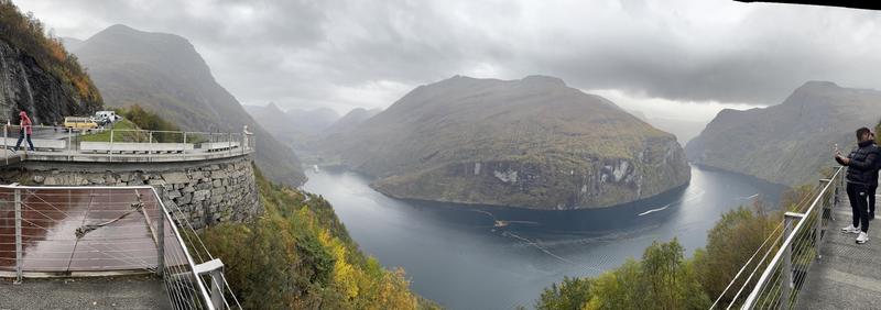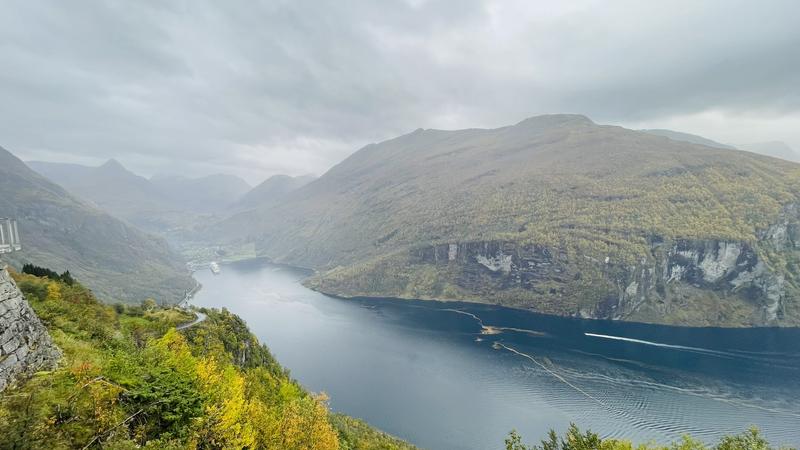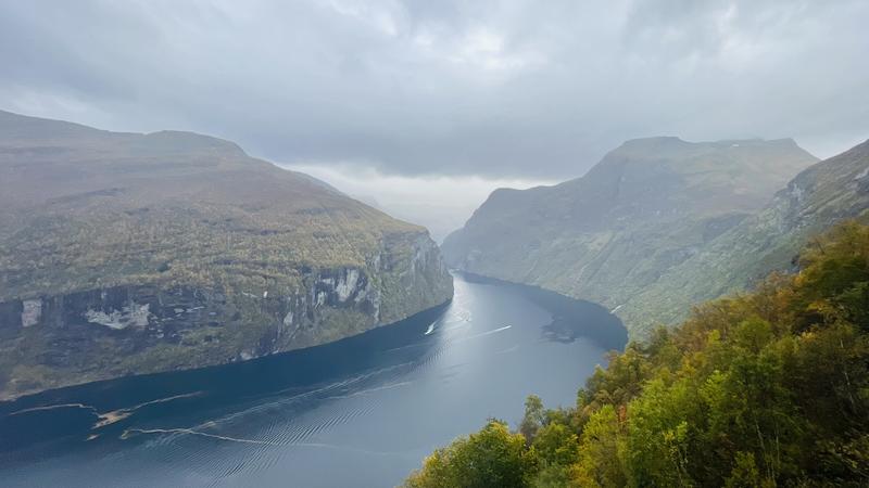 Mit der Fähre setzten wir von Linge nach Eidsdal über und kamen dann zum Aussichtspunkt Ørnesvingen mit einem traumhaften Blick auf den Geirangerfjord. Leider etwas regnerisch, aber trotzdem wunderschön.