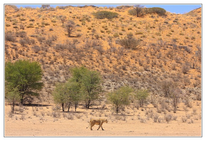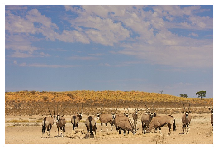Weiter geht die Fahrt wie gestern über die herrliche Dünenpiste zurück zum trockenen Flusstal des Auob River der nur nach sehr seltenen heftigen Regenfällen Wasser führt. Wieder erleben wir an der Strecke, die sich im Auf und Ab an die orangen Sanddünen schmiegt, vor allem viele Oryx-Antilopen.