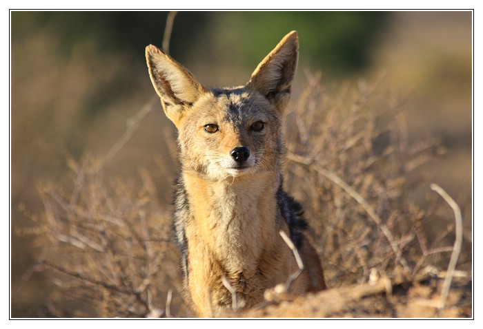 Heute ist der Morgen der Schakale. Zunächst sehen wir einen gleich am ersten Wasserloch auf unserem Weg nach Süden ...