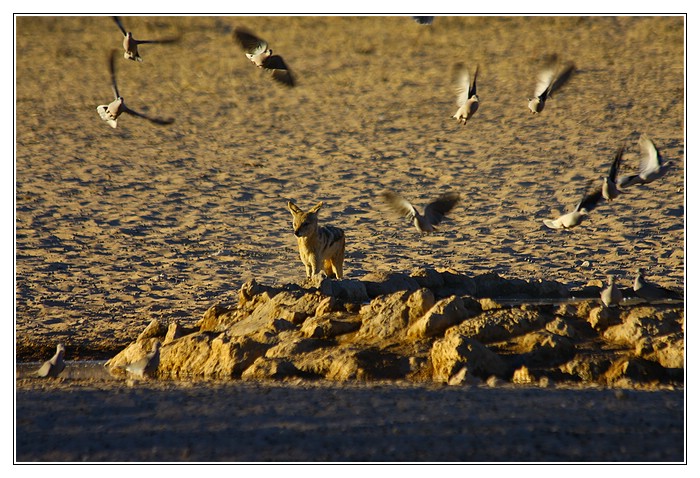 Ein Schakal schaut auch mal vorbei und schreckt die Vögel am Wasserloch auf.