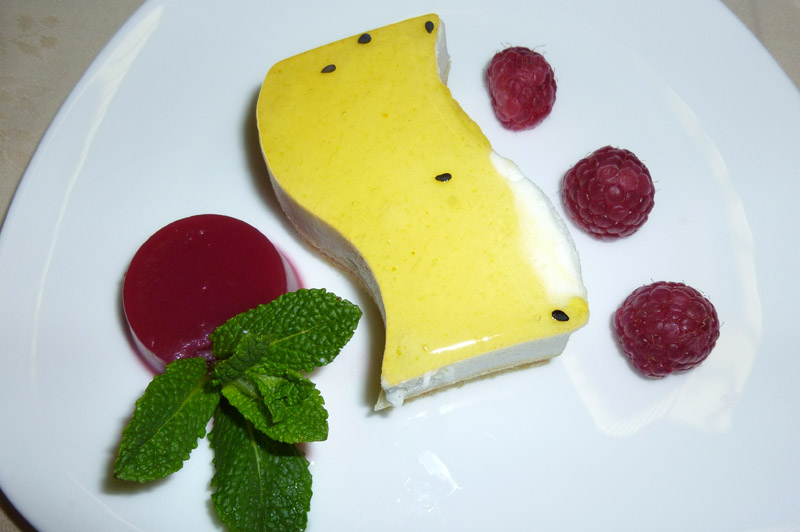Los geht es mit Kartoffeln und Feta-Käse als Amuse Gueule, dann ist der Kaviar-Gang dran. Danach bin ich eigentlich schon fast satt. Gut, dass es vorhin in der Lounge dann doch nur die Brezel war. Es folgen Heilbutt und Lachs, eine Pilzrahmsuppe und ein Salat. Da schaffe ich jeweils schon nur noch die Hälfte. Auch der Hauptgang, Langusten mit Bandnudeln, muss leider teilweise unerledigt in die Küche zurück. O je, wenn ich so weitermache, werde ich die nächsten drei Wochen schlechtes Wetter haben. Also reiße ich mich zusammen und vertilge wenigstens den Käsegang, das Obst und den Nachtisch komplett.