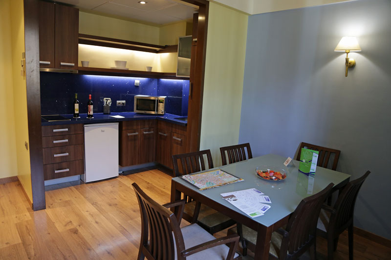 Das Hotel bietet beim Frühstück eine ordentliche Auswahl und rundet damit das positive Bild ab, das wir schon gestern gewonnen haben. Um 10 Uhr löhnen wir die geforderten 22,50 Euro in der Tiefgarage und fahren los nach Granada. Unterwegs scheint das Navigationsgerät zu beschließen, uns nicht nur Autobahn fahren zu lassen und lotst uns für ein paar Kilometer auf die kurvige Küstenstraße. Die ist aber echt schön, und zum Schluss führt uns das Navi auch wieder brav auf die Autobahn nach Granada. Dort lotsen das Navi und ich Elsa mit gemeinsamer Kraftanstrengung durch ein paar größere und kleinere Straßen bis zur Calle Cedran neben unserer heutigen Unterkunft, den Suites Gran Via in der Gran Via Colon. Elsa bugsiert den Seat auf einen halbwegs annehmbaren Warteplatz in der engen Straße, ich schreite die hochherrschaftliche Treppe zum Eingang hinauf. Netterweise ist unsere Suite gerade fertig geworden und der kleine Parkplatz des Hotels grenzt an die Seitenstraße, so dass wir das Auto durch das Tor fahren und gleich unsere Zimmer beziehen können. Zwei Schlafzimmer, ein Bad, ein Wohnzimmer mit Küchenecke, dazu ein schöner kleiner Innenhof unten im Hotel, wir sind begeistert - und deshalb gibt’s hier auch Fotos der Unterkunft: