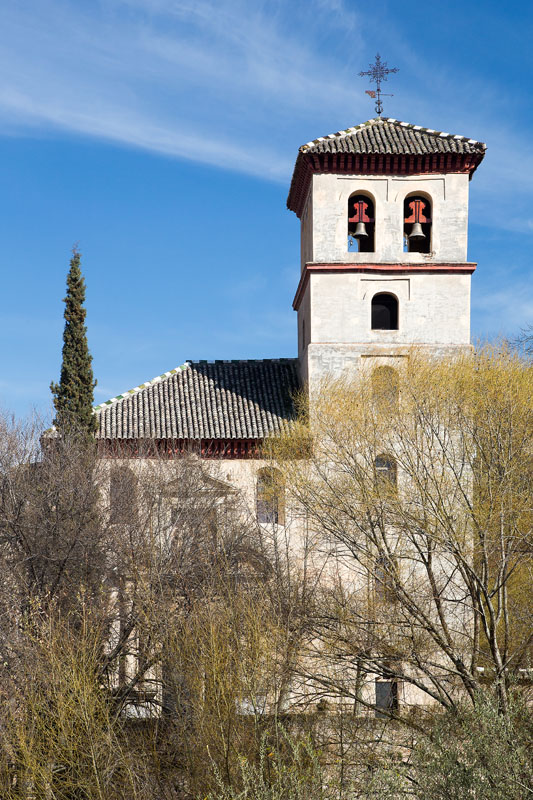 Weil wir vom Hinaufspazieren schon wieder Durst haben, setzen wir uns an einem Café auf die  Terrasse mit Blick auf die Alhambra, trinken Kaffee und kalte, diesmal nichtalkoholische Getränke und lassen den Blick auf uns wirken. Hier könnten wir ewig sitzen bleiben und tun es zumindest auch bis viertel vor sechs. Dann schauen wir zuerst in die kleine Kirche San Nicolas und dürfen für 2 Euro pro Nase auch noch hinauf auf den Glockenturm steigen, von dem sich auch schöne Blicke auf die Stadt und auf die darüberliegenden Hügel ergeben. Und natürlich sieht man auch von hier aus die Alhambra.