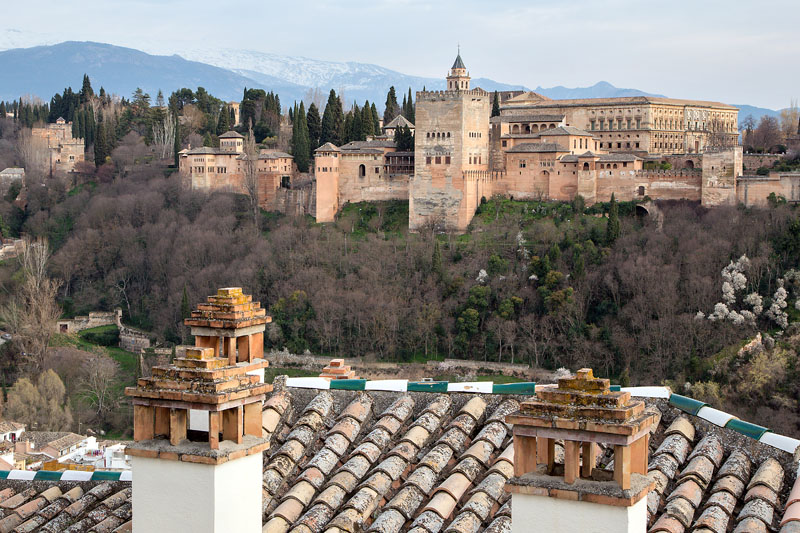 Enge Straßen, kleine Höfe, ab und zu stehen Orangenbäume vor den Häusern. Weiter oben bietet sich schon ein erster Blick auf die Alhambra, aber am Mirador de San Nicolas vor einer kleinen Kirche öffnet sich der Blick auf den gegenüberliegenden Hügel mit der Alhambra und die schneebedeckten Gipfel der Sierra Nevada.