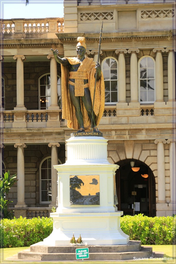 Davor die Statue Königs Kamehameha I, dem Krieger, der die Inseln zu einem Königreich vereint hat. Zum Staatsfeiertag im Juni wird er immer noch mit bunten Blumengirlanden geschmückt.