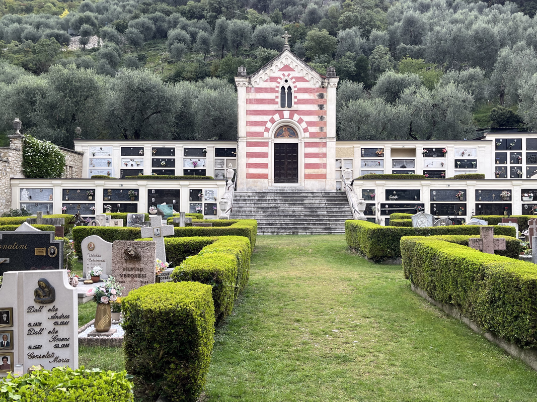 Am Parkplatz in Brenzone sind wir erst mal vorbei gefahren, denn als das Navi was von links abbiegen sagte haben wir nur eine Hofeinfahrt gesehen, sind also dran vorbei gefahren, gewendet, beim zurückfahren ganz langsam gefahren und in diese "Einfahrt" steil bergan reingefahren, das war dann wirklich eine Strasse...an diese Art Strassen muss man sich am Gardasee einfach gewöhnen. Der Parkplatz liegt steil am Hang (deswegen auf 2 Ebenen) und es war noch ausreichend Parkplatz frei. Man konnte wieder mit EasyPark bezahlen (mit 8 € ziemlich teuer). Der Parkplatz lag neben dem Friedhof, da haben wir noch einen Blick reingeworfen