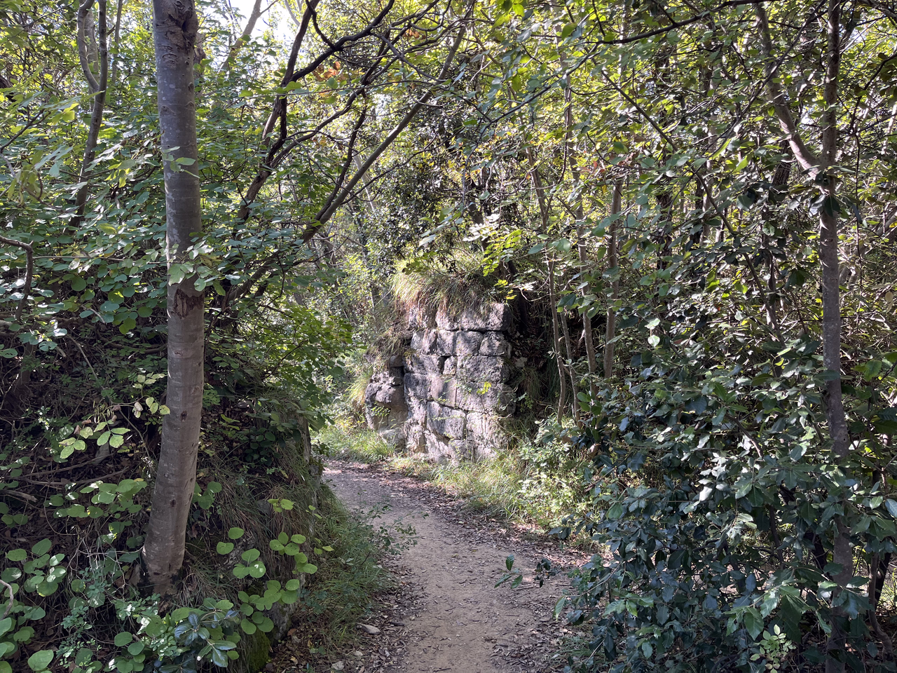 tja und dann wurde es schwierig. Der Weg sollte in Kehren durh den Wald abwärts führen. Leider war kaum ein Weg zu erkennen und wir hatten ja das Garmin nicht dabei. Einmal sind wir querfeldein durch den Wald gegangen weil wir weiter unten einen breiteren Weg sehen konnten, von da haben wir uns aber wieder verlaufen bzw. es existierte schlicht kein Weg und der Abhang im Wald wurde immer steiler. Ich habe schließlich gemeutert und wir sind auf dem breiteren Weg zurück und zur Forte Batteria de Mezzo gegangen und wie auf dem Hinweg zurück zum Parkplatz.