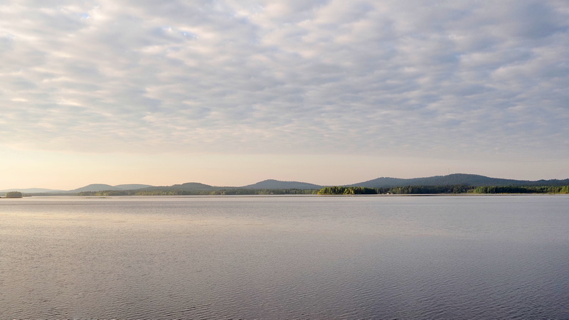 Die sich nebenan befindliche Ausstellung zum Nationalpark hat länger geöffnet, die schaue ich mir noch an, dann geht’s zum Auto und zurück nach Kemijärvi. Hier hat es ein paar mehr Wolken, ich halte aber dennoch am Strand nicht weit vom Hotel und mache ein paar Fotos, außer mir ist niemand hier, das sieht im Sommer wohl ganz anders aus, hier kann man sicher toll schwimmen und sich am Sandstrand sonnen.