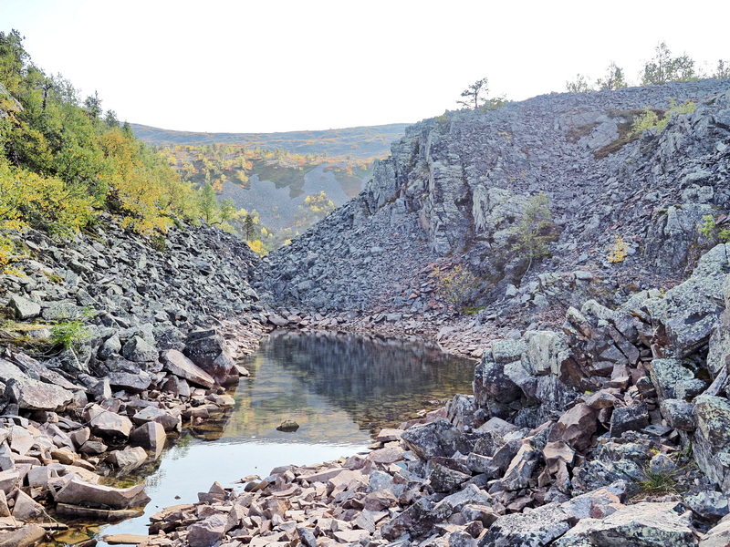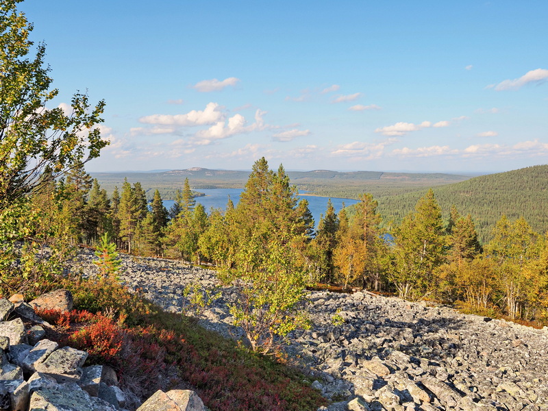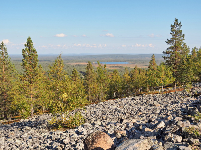 Nach einer kurzen Pause gehe ich weiter – nun beginnt die schwerste Etappe der Wanderung, es geht über ein Geröllfeld steil bergauf. Mit so einem schweren Weg habe ich nicht gerechnet, ich bin zwar früher in den Alpen auch schon über Geröllfelder gewandert, allerdings (zumindest in meiner Erinnerung) noch nie über ein so langes und steiles Stück und vor allem nicht über so große Felsen. Zunächst nutze ich noch meine Stöcke, dann packe ich sie samt der Kamera weg (einen Eindruck von der Art des Geröllfeld bekommt ihr, wenn ihr mein Foto anschaut, dass ich zum gestrigen Tag bei der Wanderung auf den Valtavaara gezeigt habe, dort bin ich gegen Ende der Wanderung an einem kleinen Geröllfeld vorbeigekommen, heute geht es über genau solche Felsansammlungen, nur dass das heutige Geröllfeld von der Gesamtfläche wesentlich größer ist) und gehe auf allen Vieren weiter. Zwischendrin würde ich am liebsten aufgeben, aber das ist natürlich keine Option, denn umzudrehen, also bergab zu gehen, wäre noch schwieriger.
