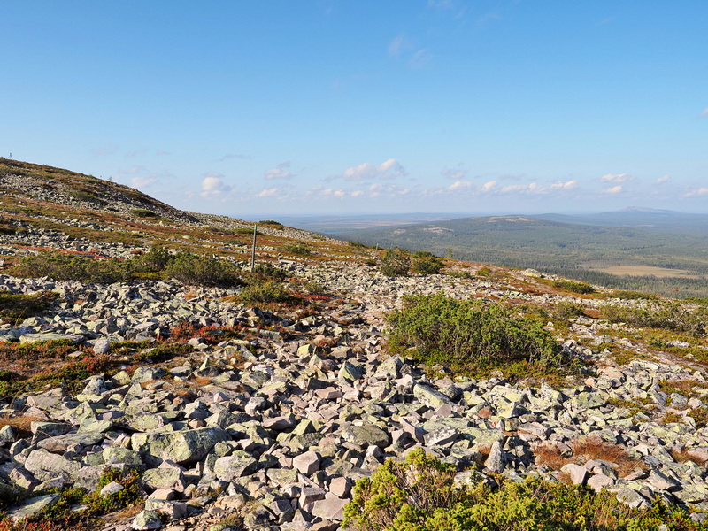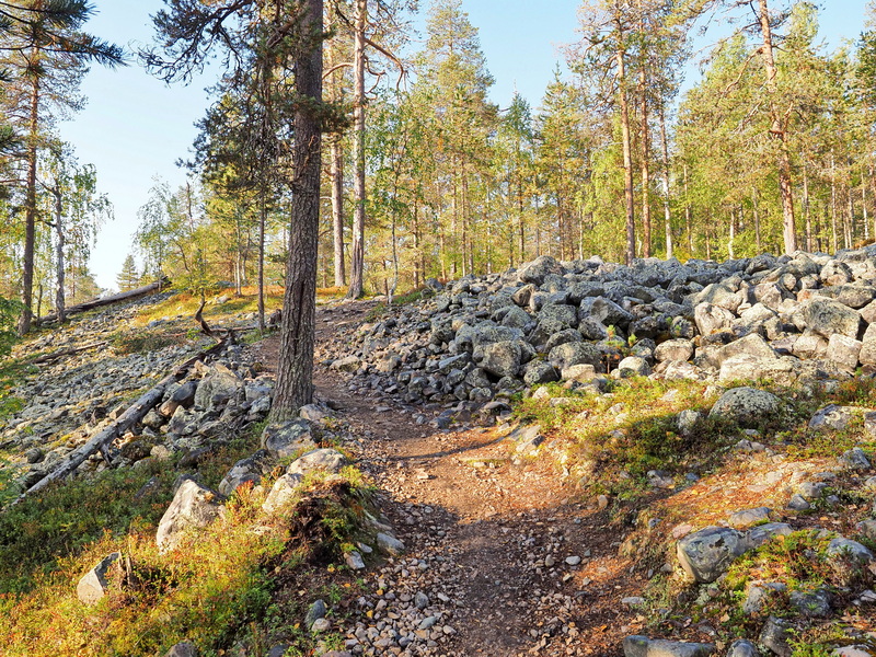 Ab hier wird der Waldpfad so, wie ich ihn von zahlreichen anderen Wanderungen in Finnland kenne, von Steinen, Felsen und Wurzeln durchzogen. Die Anzahl der Steine erhöht sich nach und nach und bald hole ich meine Wanderstöcke aus dem Rucksack bzw. von der Befestigung am Rucksack, das hilft schon sehr, gerade auch auf den nach dem morgendlichen Tau nassen Steinen und Wurzeln. Bald geht es fast ausschließlich über Geröllfelder, ein sehr langsames Vorankommen. Ein älteres Ehepaar, das hinter mir unterwegs war, gibt irgendwann auf, ich werde aber auch von Wanderern, die über die Steine tänzeln, als wäre es fester, ebener Boden, überholt.