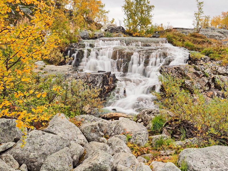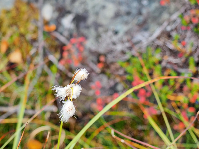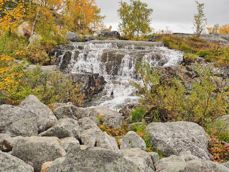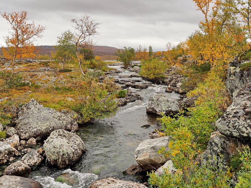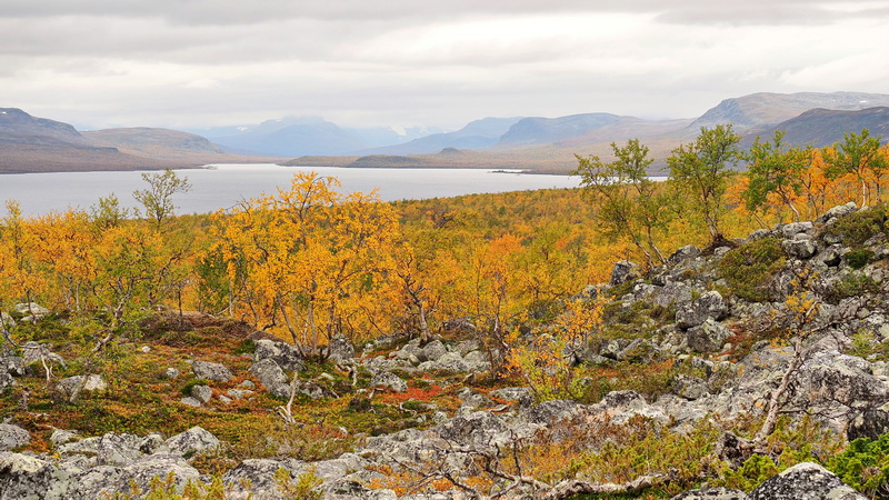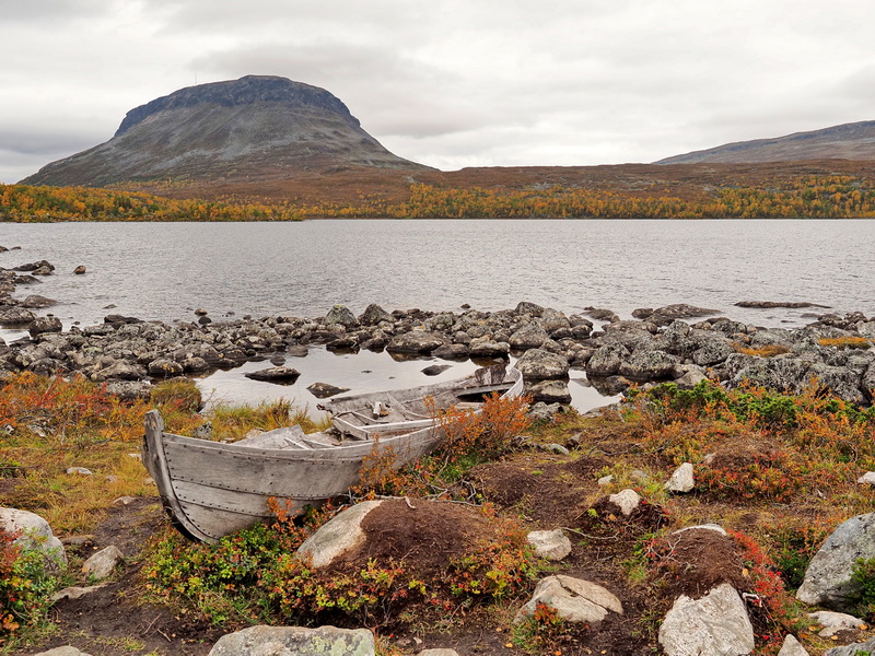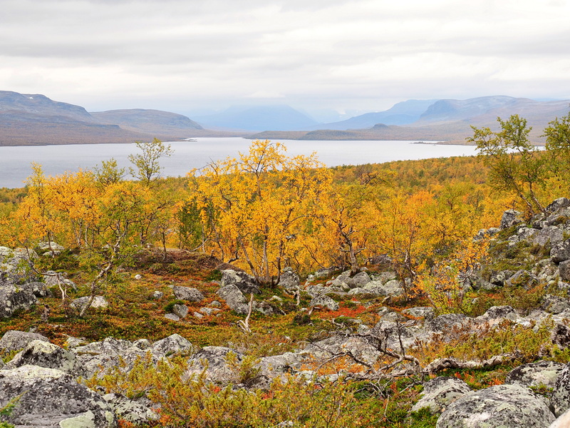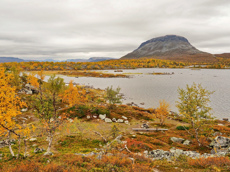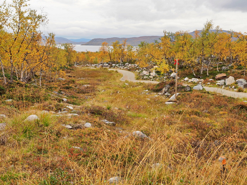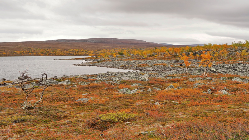 Bald schon habe ich einen ersten Blick auf den Saanatunturi (oder auch nur Saana), der mit 1029 m Höhe die Gegend dominiert und für die Ureinwohner heilig ist. Dann kommt der See ins Blickfeld und mit ihm ein ganzes Bergpanorama, zusammen mit der herbstlichen Vegetation eine traumhaft schöne Umgebung.
