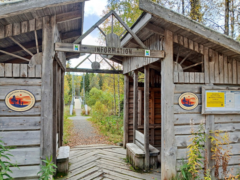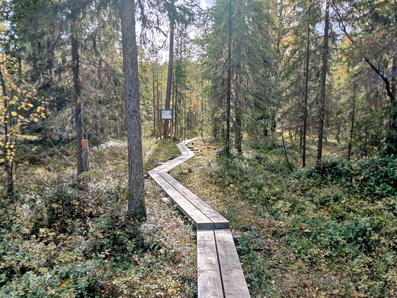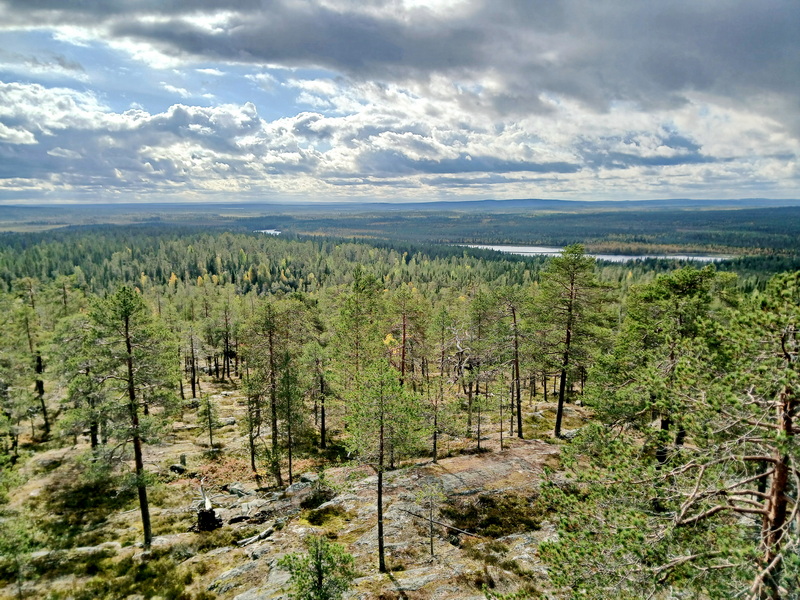 Der Weg führt dann mit mäßiger Steigung mal auf Holzbohlen, mal auf einem recht gut begehbaren Waldweg zu einem Aussichtsturm, von dem man einen schönen Blick über die umliegenden Wälder und den Raudanjoki hat.