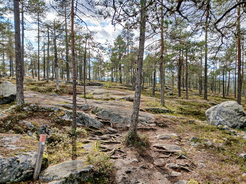Nur ein paar Kilometer vom Weihnachtsmann Dorf entfernt und auf direktem Weg nach Kemijärvi liegt die Arctic Circle Hiking Area mit einigen Wanderwegen. Ein bisschen Bewegung brauche ich noch, daher fahre ich nun auf einen Parkplatz an dem ein eher kürzerer Trail, der für mich heute bewältigbar ist, startet (Vikaköngäs parking area). Das ist jetzt ungeplant, aber meine Wanderschuhe sind ja sowieso immer im Auto, nur für Fotos muss ich mich aufs Handy beschränken, die Kamera habe ich im Hotel gelassen.