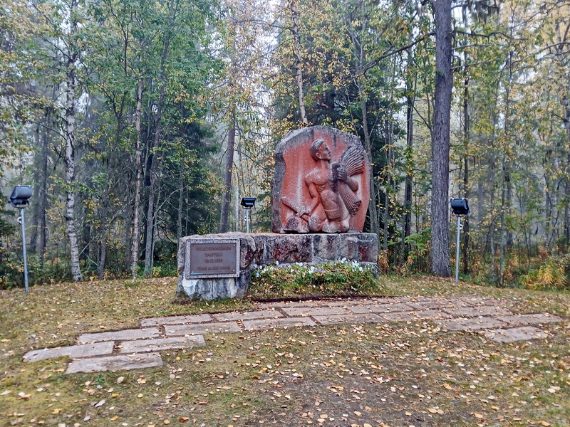 Einen kurzen Halt mache ich schon nach ungefähr einer dreiviertel Stunde, es wird ein Denkmal samt WC angekündigt, letzteres hat dann geschlossen, das Denkmal schaue ich mir an, es geht um eine Schlacht im Winterkrieg an dieser Stelle: Mitte Dezember 1939, also nur wenige Wochen nach Beginn des Kriegs zwischen Russland und Finnland, konnten die Finnen hier beim Ort Pelkosenniemi, wie auch an anderen Stellen die russischen Truppen sehr überlegen zurückschlagen, finnischen Verlusten von 117 Gefallenen standen auf russischer Seite über 1000 gefallene Soldaten gegenüber. Allerdings (und darauf wird hier nicht eingegangen), siegten bereits einige Monate später die Russen, Finnland konnte zwar seine Souveränität wahren, musste aber große Gebiete entlang der Ostgrenze an Russland abgeben.