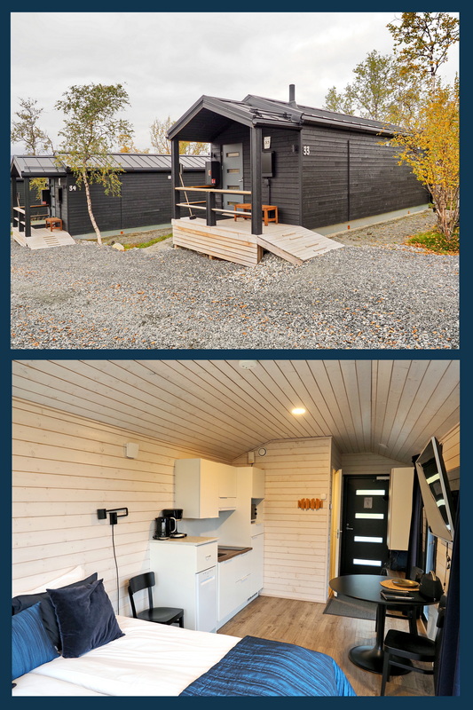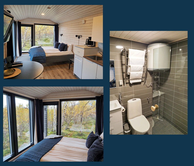 Gegen halb vier erreiche ich schließlich Kilpisjärvi, einchecken im Hotel kann man offiziell ab 16 Uhr, ich probiere mal, ob es jetzt schon geht. Das klappt und an der Rezeption bekomme ich den Schlüssel für meine Cabin. Ich bringe nur kurz mein Gepäck rein und freue mich über die moderne, gemütliche Einrichtung mit den großen Fenstern zum Wald, dann fahre ich zum nicht weit entfernt liegenden Parkplatz für meinen Spaziergang, man hätte auch zu Fuß an der Unterkunft starten können, aber ich möchte nachher noch in den Supermarkt bevor ich ins Hotel zurück fahre.
