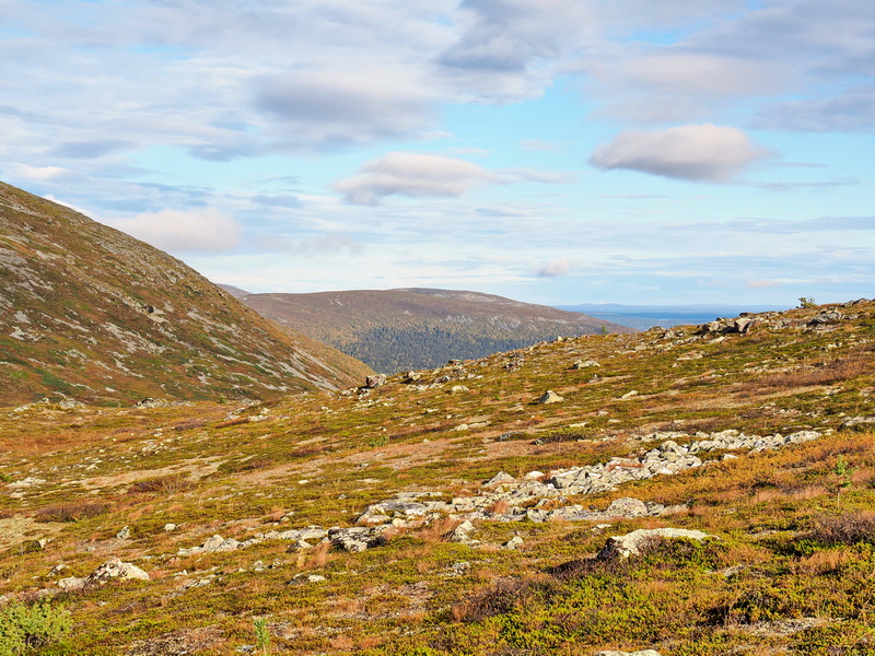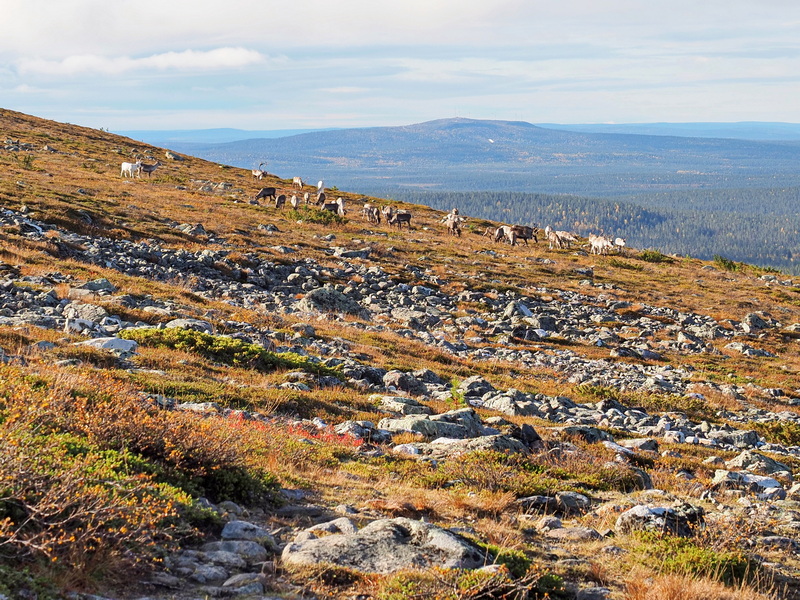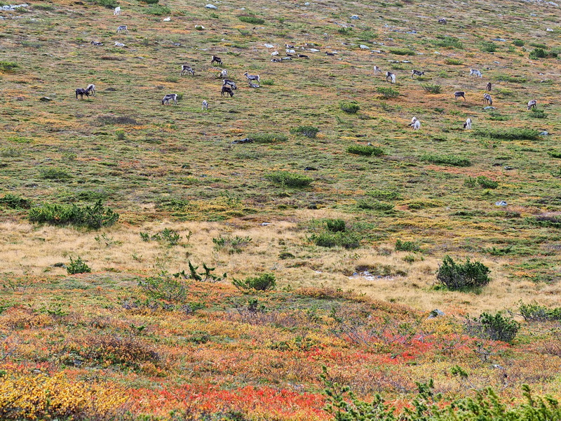 Die schöne Aussicht begleitet mich noch ein gutes Stück bergab. Und auch auf dieser Bergseite grast eine Rentierherde, leider komme ich nicht allzu nahe an sie heran.